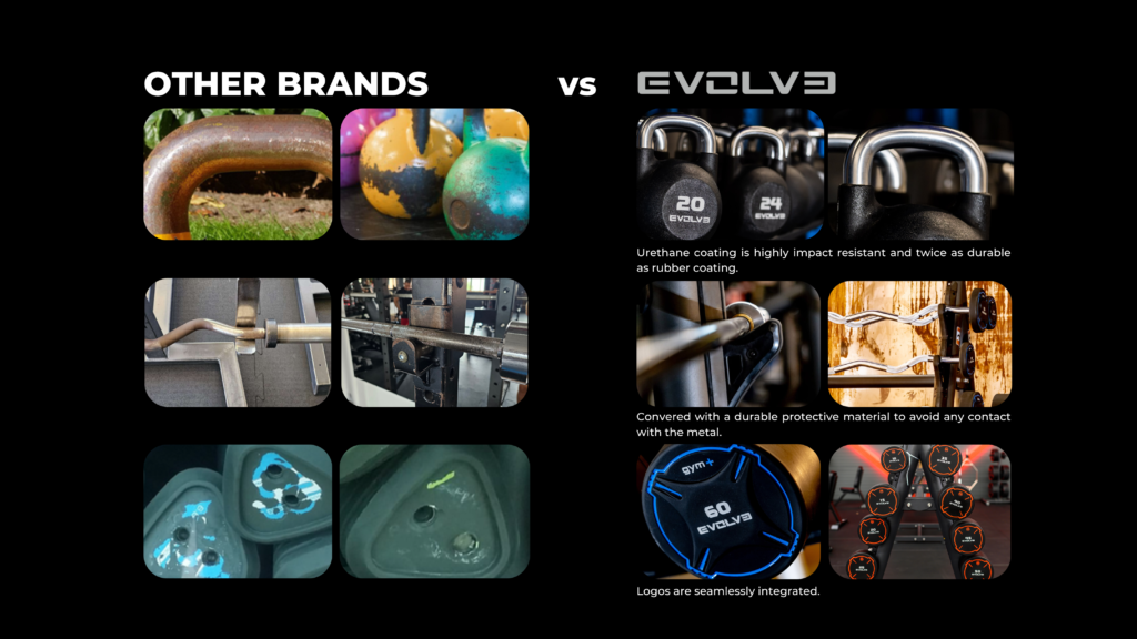 Moreover, Evolve’s integration of logos and brand markings ensures a sleek, professional look. Whether you’re lifting weights or storing them on a rack, you’ll appreciate the seamless design that complements any gym environment.