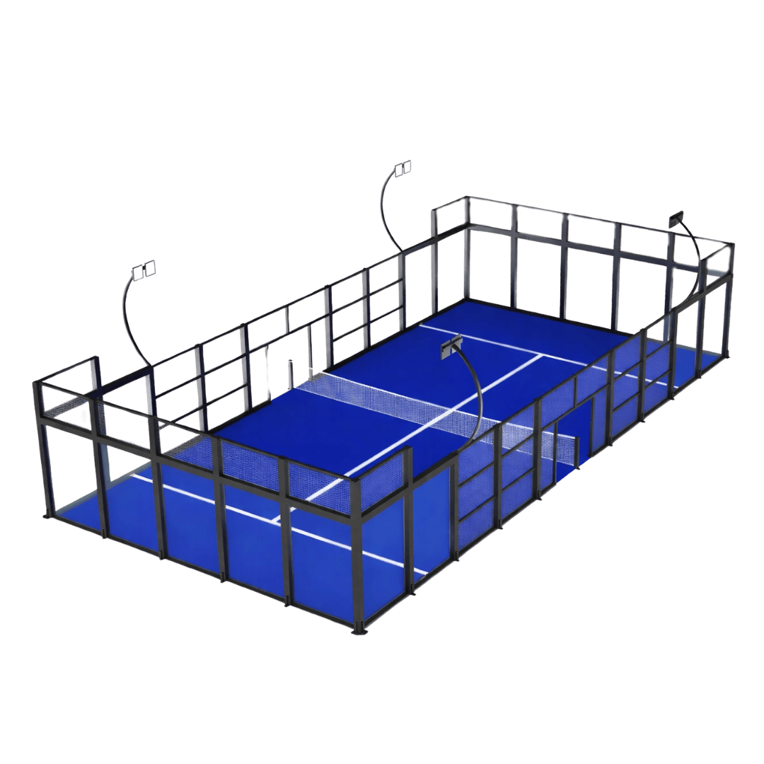 Le court est équipé de 18 unités de panneaux en verre trempé G1 de 12 mm, de tubes en acier galvanisé à chaud de 3 mm, d’un treillis en acier galvanisé à chaud de 4 mm, d’un gazon artificiel renforcé, de lampes LED IP65 adaptées à une utilisation en extérieur, de boulons en acier inoxydable 304 et de toutes les fixations, joints et composants supplémentaires nécessaires à l’installation complète du court.