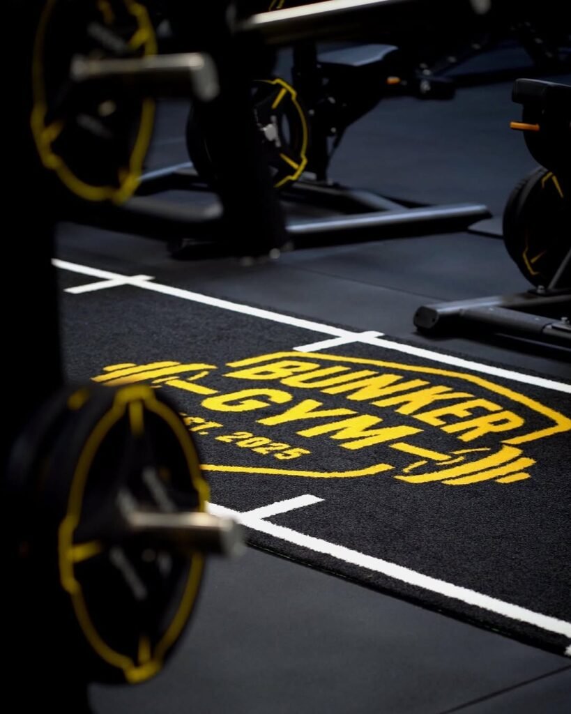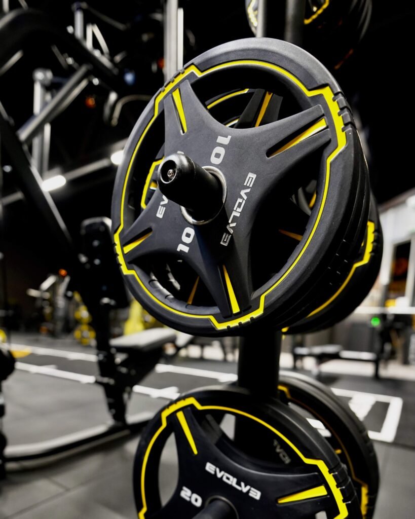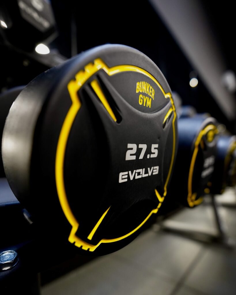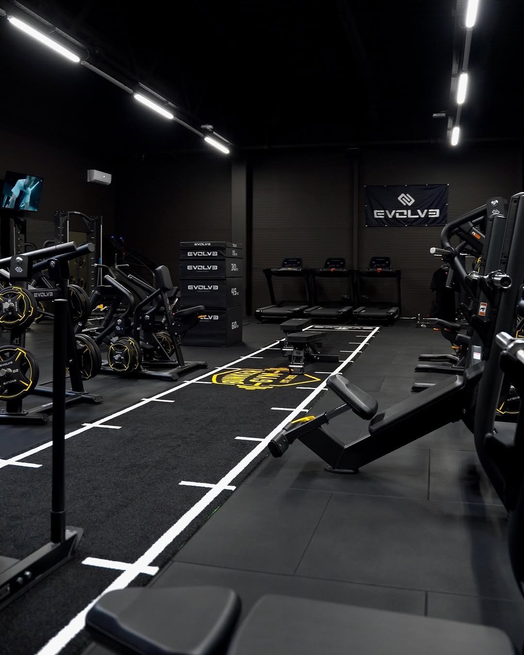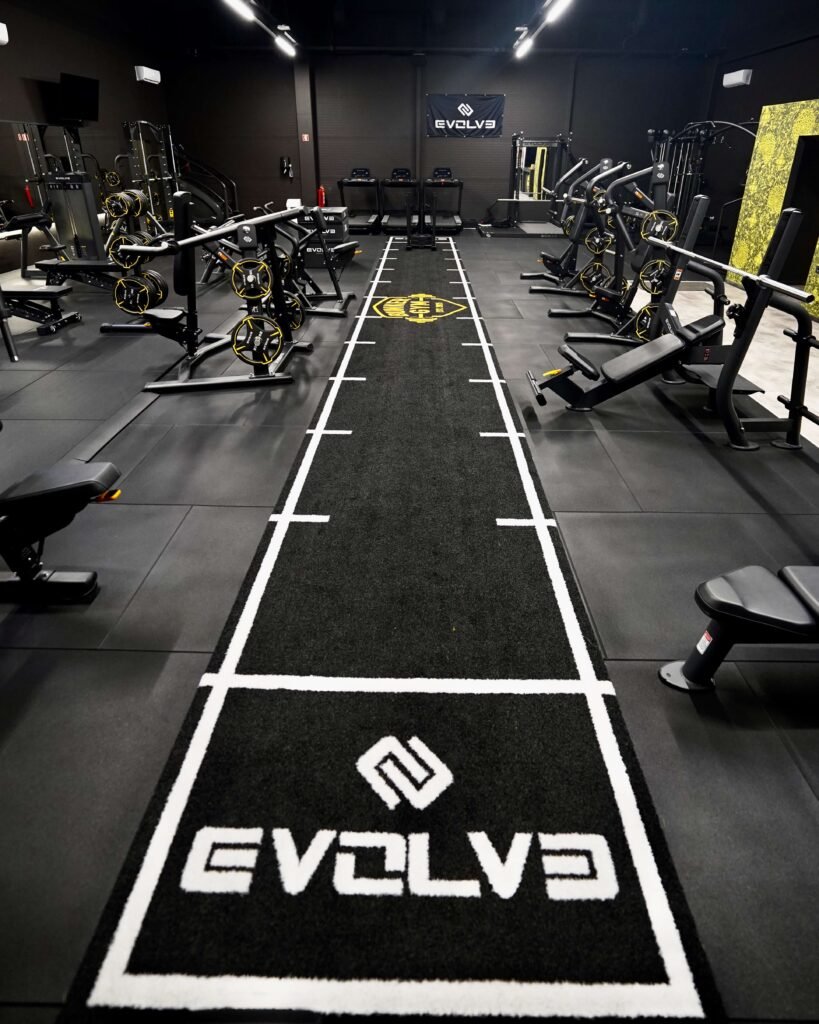 L’installation comprend des poids libres personnalisés tels que : des plaques de poids, des haltères, des plaques de poids Hi-Temp X Bumper 5-25 kg, ainsi qu’un gazon artificiel supplémentaire personnalisé avec le logo Evolve.